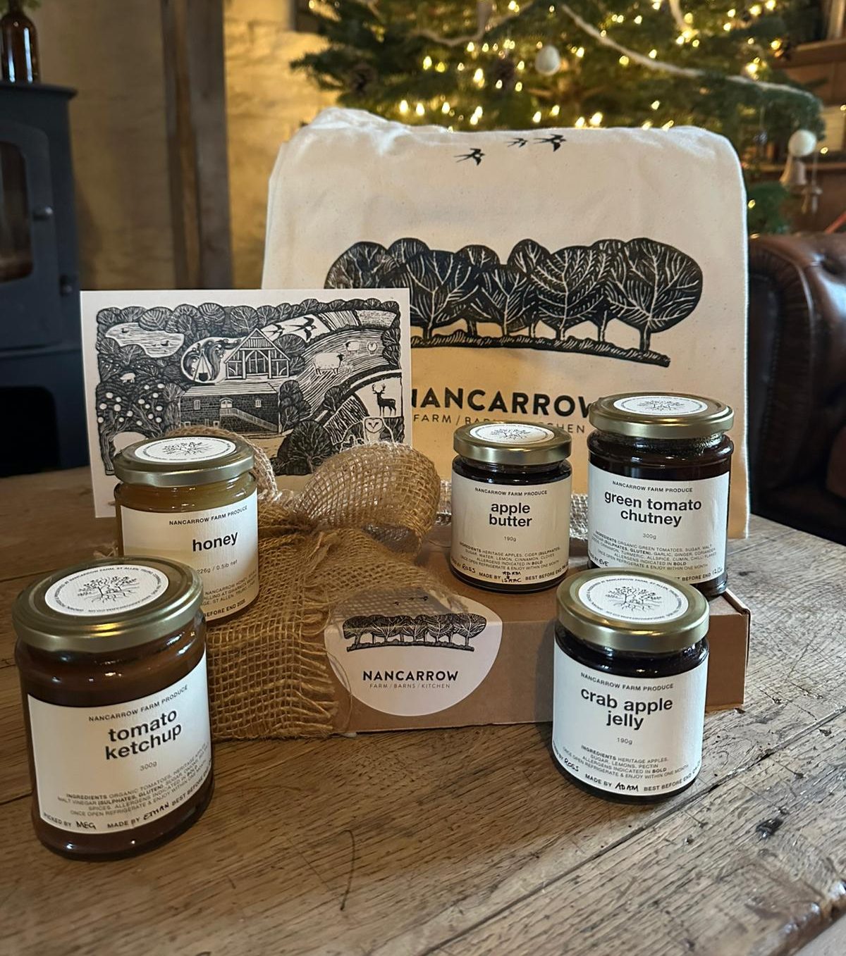A little bit of everything from the farm. A selection of handmade farm preserves, including two large and three small jars, which could include the following: Nancarrow preserves, honey, quince mustard, quincemeat, apple butter, brown sauce and red sauce. Plus a screen-printed Organic cotton Nancarrow tote bag,